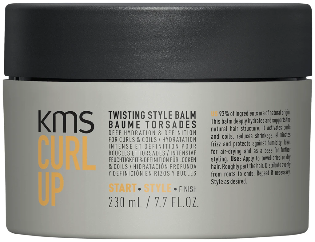 Le Baume pour boucles et torsades Curlup de KMS est idĂ©al pour le sĂ©chage Ă l’air libre et comme base pour d’autres coiffures. Il s’applique sur les cheveux secs ou sĂ©chĂ©s Ă la serviette. SĂ©parer grossièrement la chevelure et rĂ©partir la crème des racines jusqu’aux longueurs et pointes. RĂ©pĂ©ter si nĂ©cessaire.