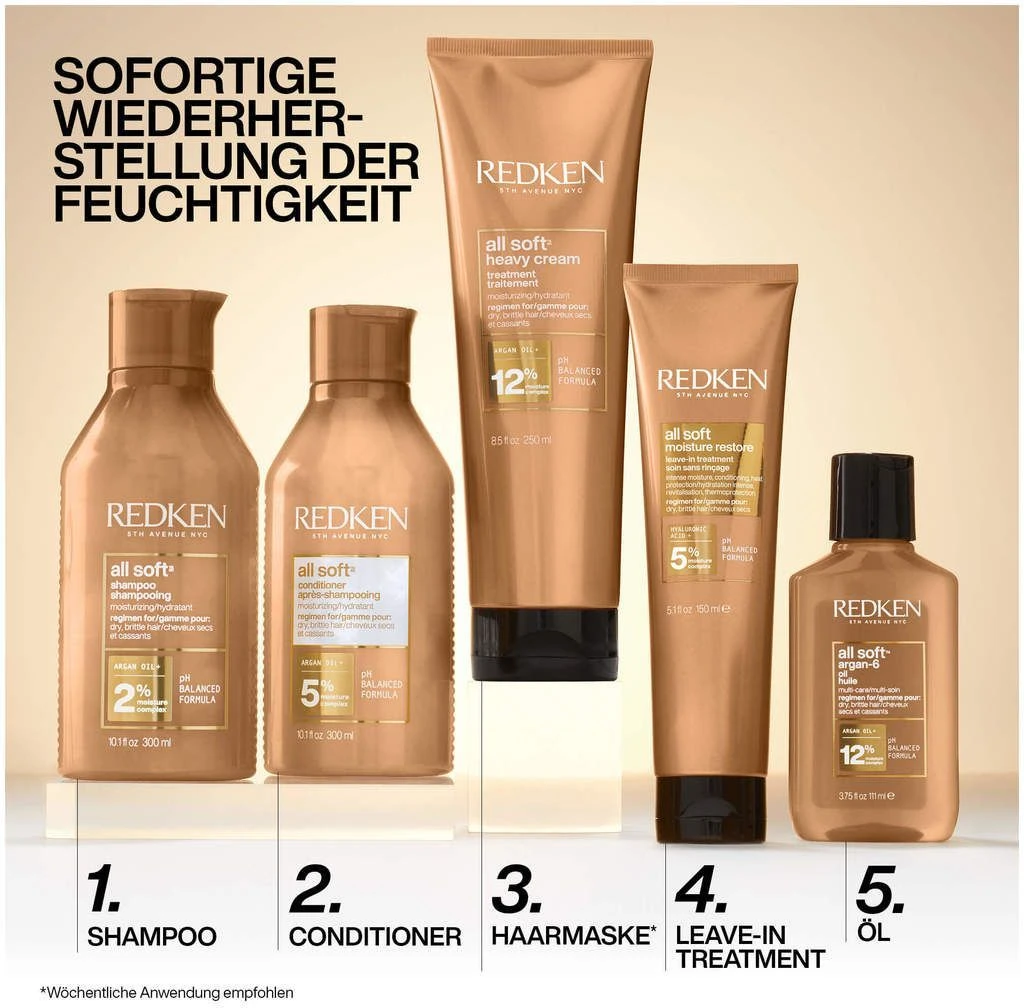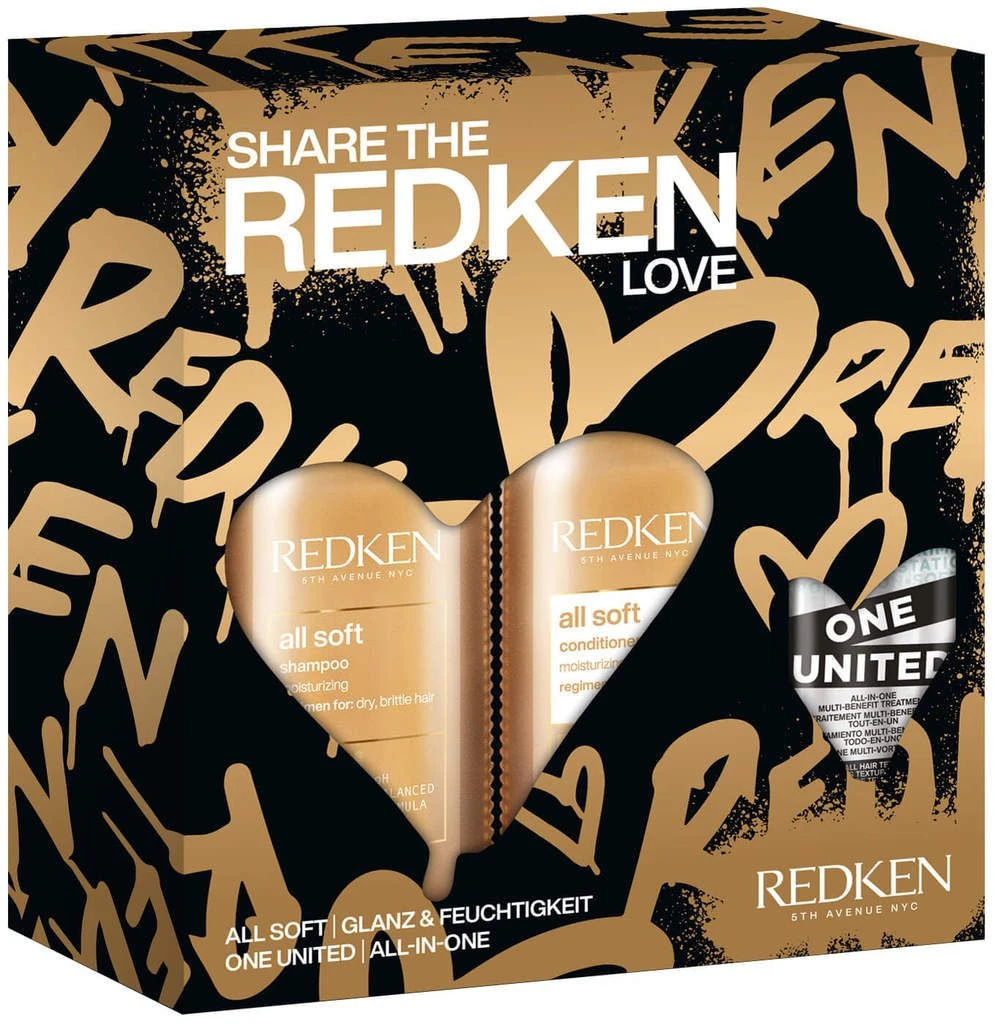 Le Set All Soft de Redken contient le shampooing All Soft (300ml), le revitalisant All Soft (250ml) et le spray soin tout-en-un One United (150ml).