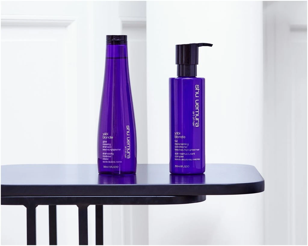 Le shampooing est suivi du Soin restructurant complet. Une fois par semaine, il convient d’utiliser le Shampooing Violet anti-faux reflets Yubi Blonde au lieu du Shampooing révélateur d’éclat, pour une neutralisation plus forte.